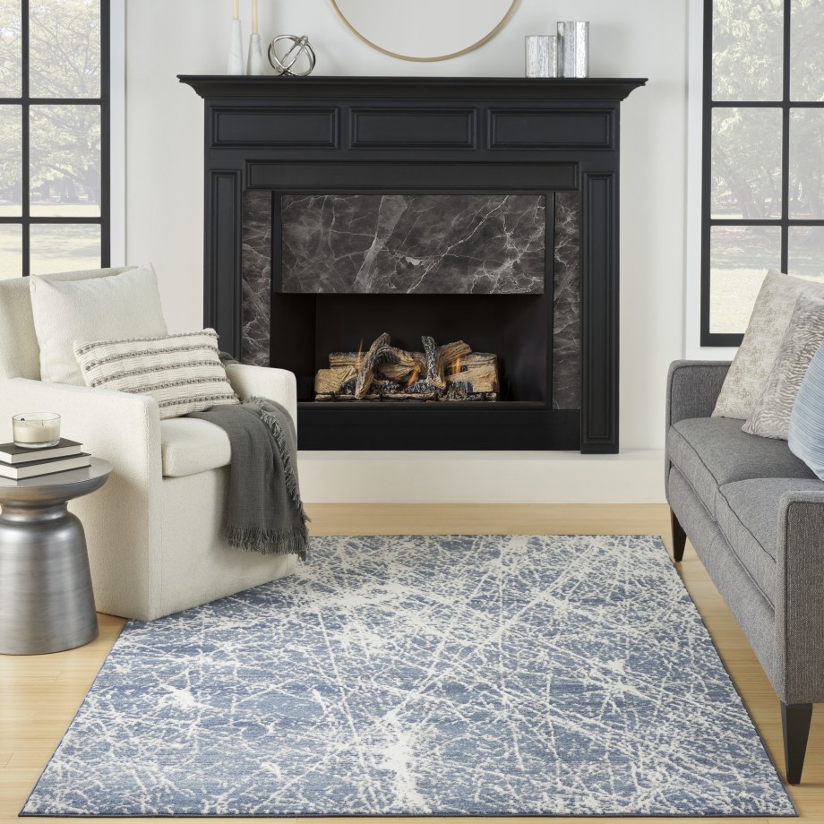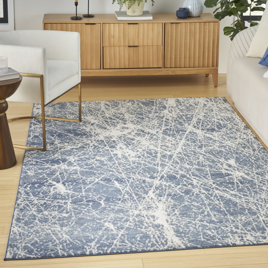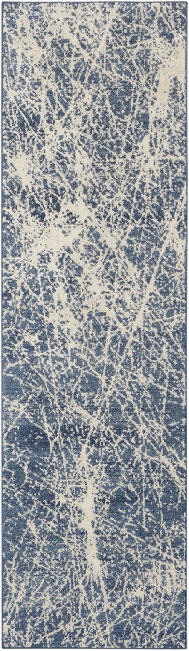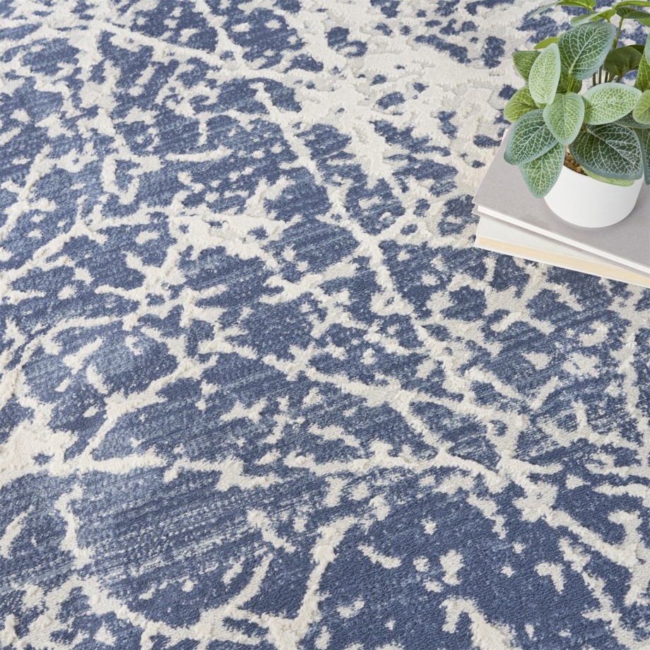 Inspired by frosted glass, this abstract rug from the Exhale Collection grounds your space in aesthetic appeal. The sprawling design is presented in navy blue and ivory, with subtle tonal variations that add visual intrigue. Place in your living room, bedroom, hallway, or kitchen for an instant style refresh. Machine-made from a blend of polyester and polypropylene yarns that are softly textured and easy to clean.