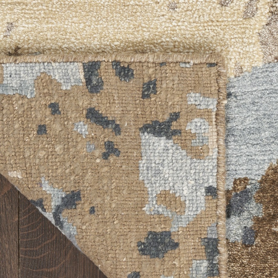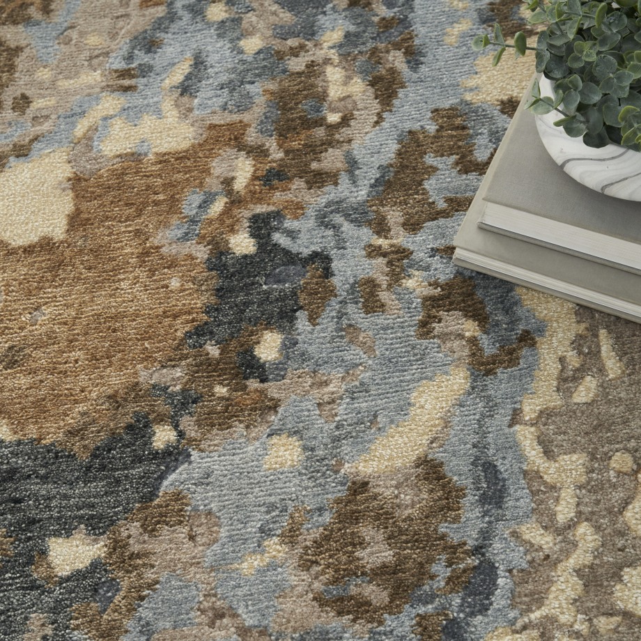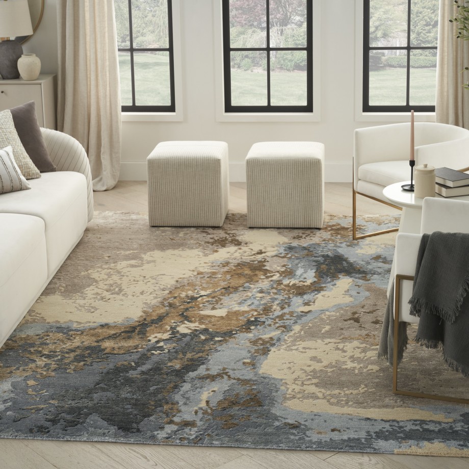 Indulge in the timeless allure of this abstract Silk Shadows rug. The refined pattern embodies sophistication with a mineral-inspired palette of exquisite blues, soothing beiges, and gentle sand tones. Handmade from a luxurious blend of silk-like yarns and wool.