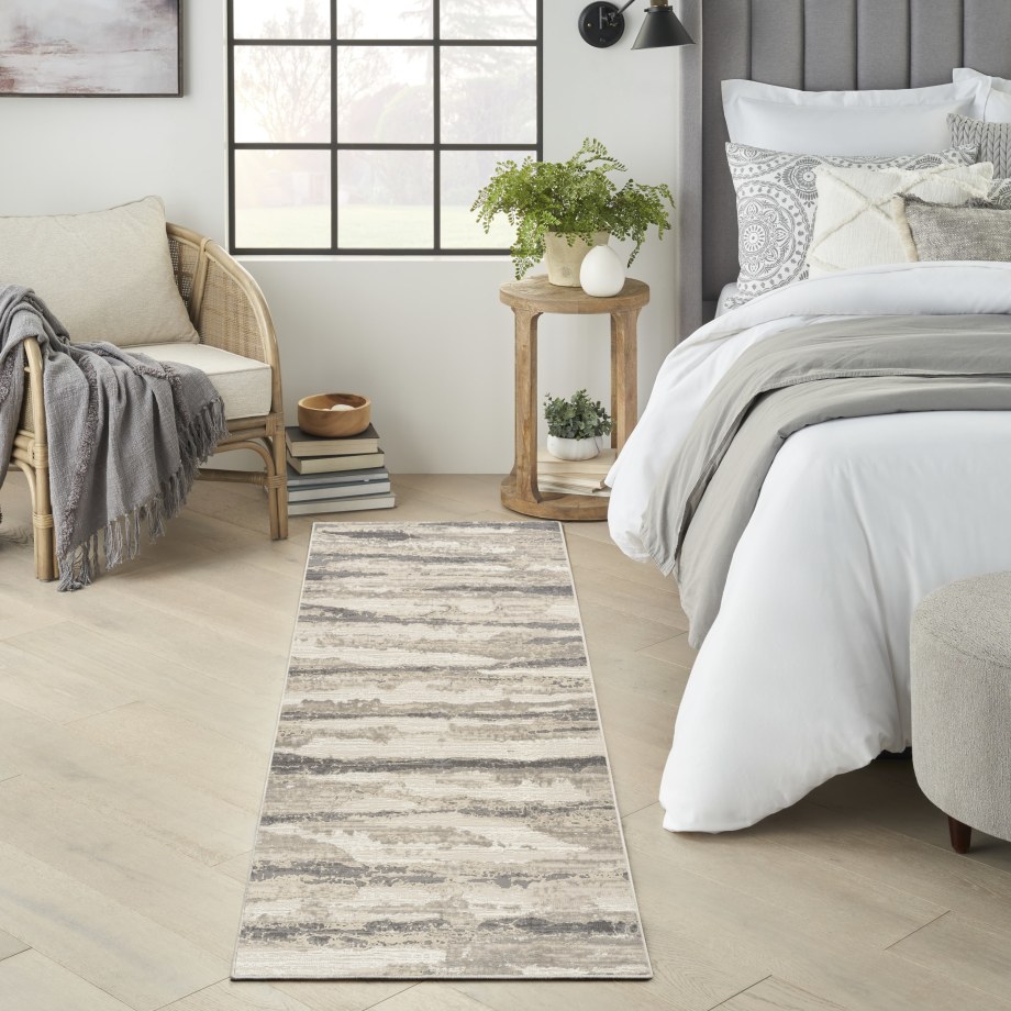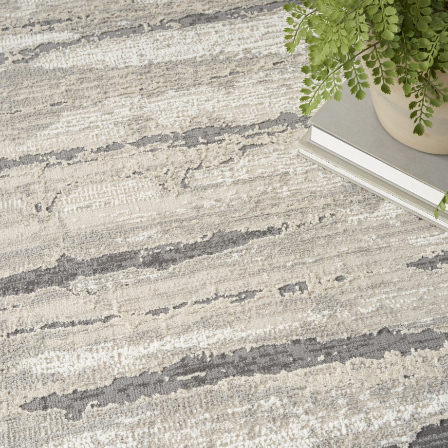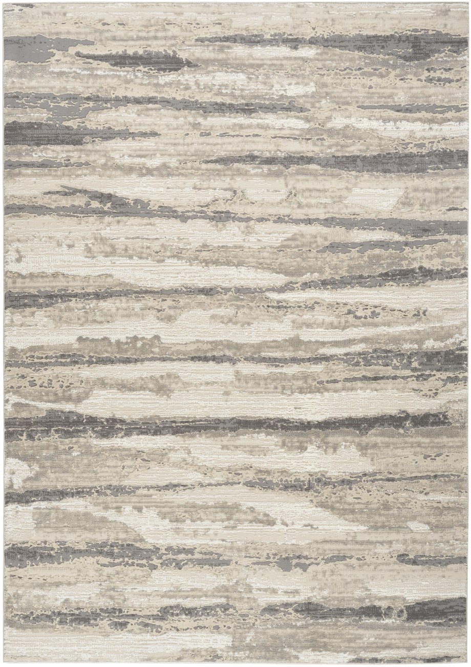 Invite movement and depth to your space with this abstract rug from the Sustainable Trends Collection. The irregular stripe pattern is presented in beige, ivory, and grey tones that are delicately layered to create a sense of dimension. Sustainably crafted from recycled polyester fibers for a stylish, eco-friendly way to decorate your living room, hallway, bedroom, or kitchen.