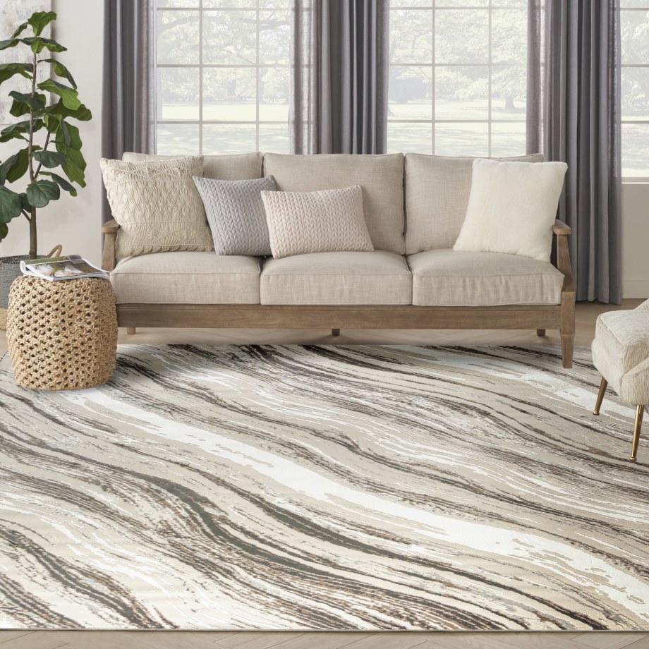 Create a state of flow with this abstract rug from the Sustainable Trends Collection. The wavy grey, ivory, and brown pattern adds visual appeal to your living room, bedroom, hallway, or kitchen décor. Woven from recycled polyester yarns, this softly textured rug is ultra-durable for fuss-free cleaning and lasting style.