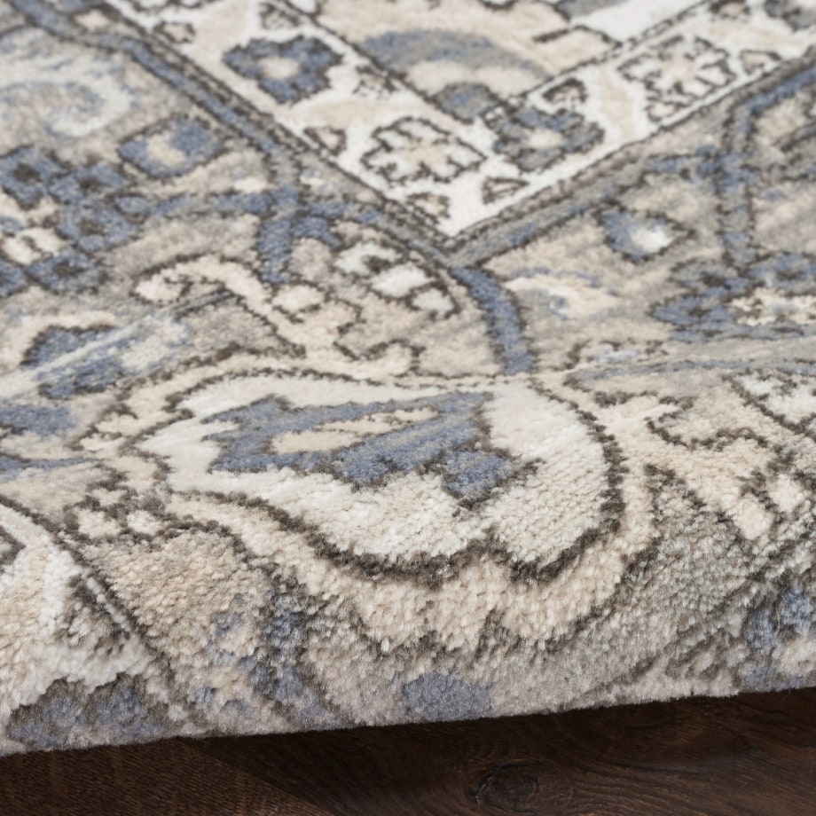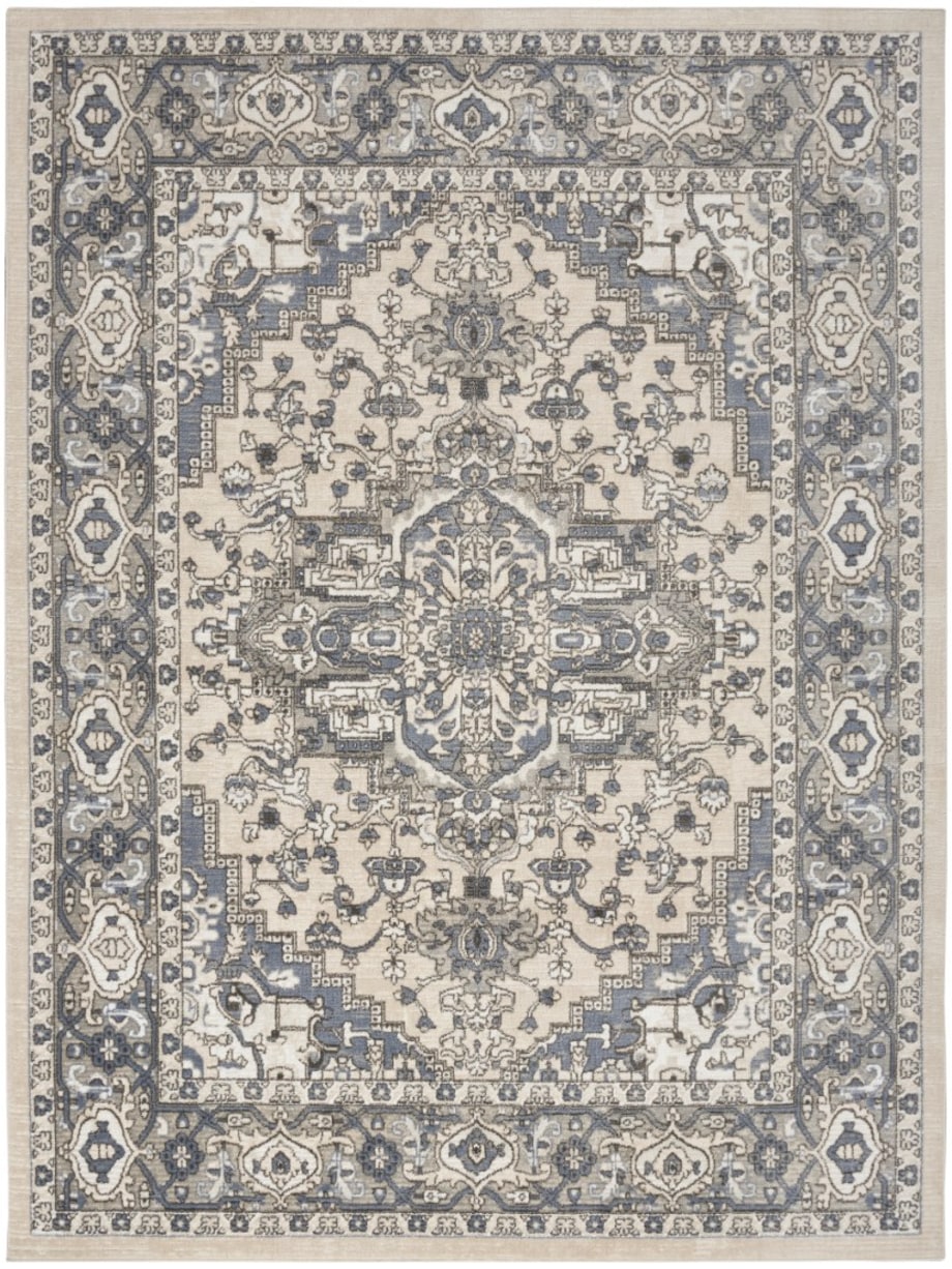 A classic center medallion motif framed in magnificent shades of blue gives this ivory-ground Quarry area rug special appeal. Its intricate Persian garden design with wide ornamental border gains vintage allure from a specially treated surface fade. With high cut-pile, it is an exquisite focal point for your living room, dining room, family room, bedroom or home office.