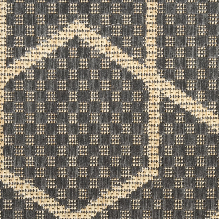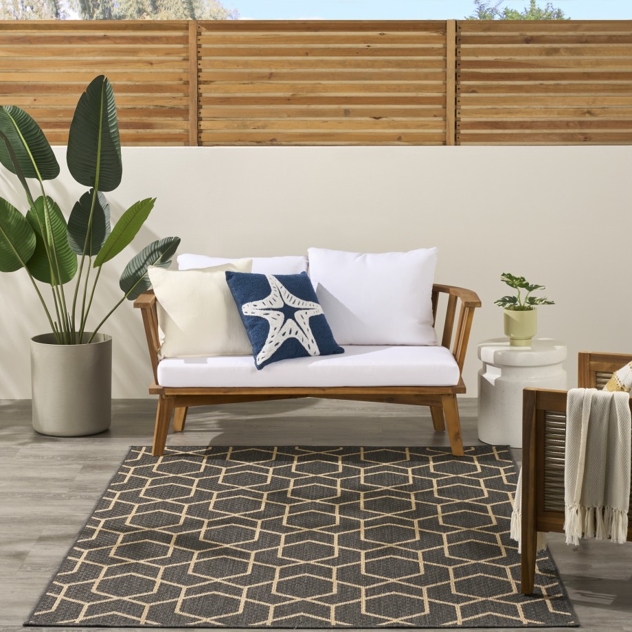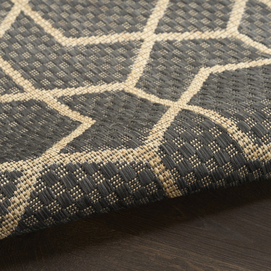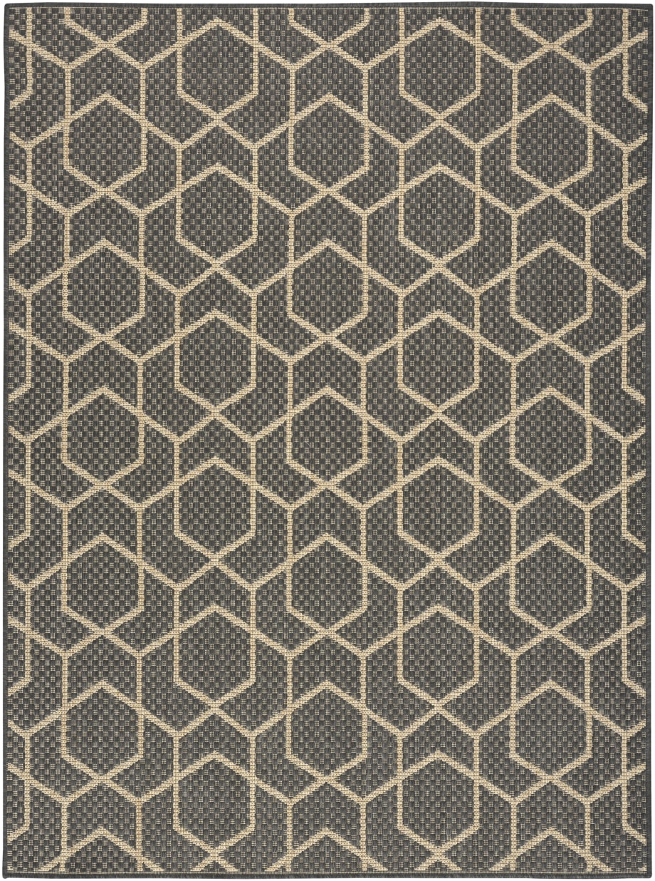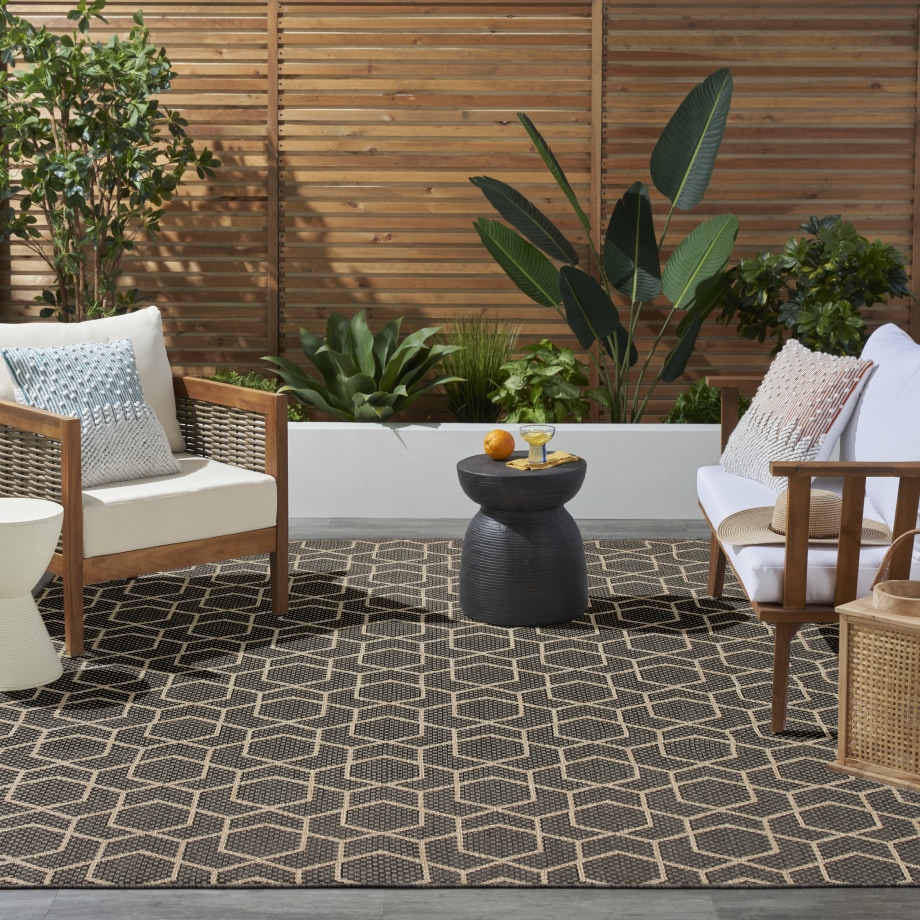 Sleek and modern, this charcoal grey geometric outdoor rug from the Horizon Collection offers a contemporary take on classic design. The eye-catching pattern effortlessly complements a variety of settings —from urban balconies to cozy living rooms — while adding depth and visual appeal. This flatweave rug is made from a blend of polyester and polypropylene with a subtle high-low pile and tonal variations.