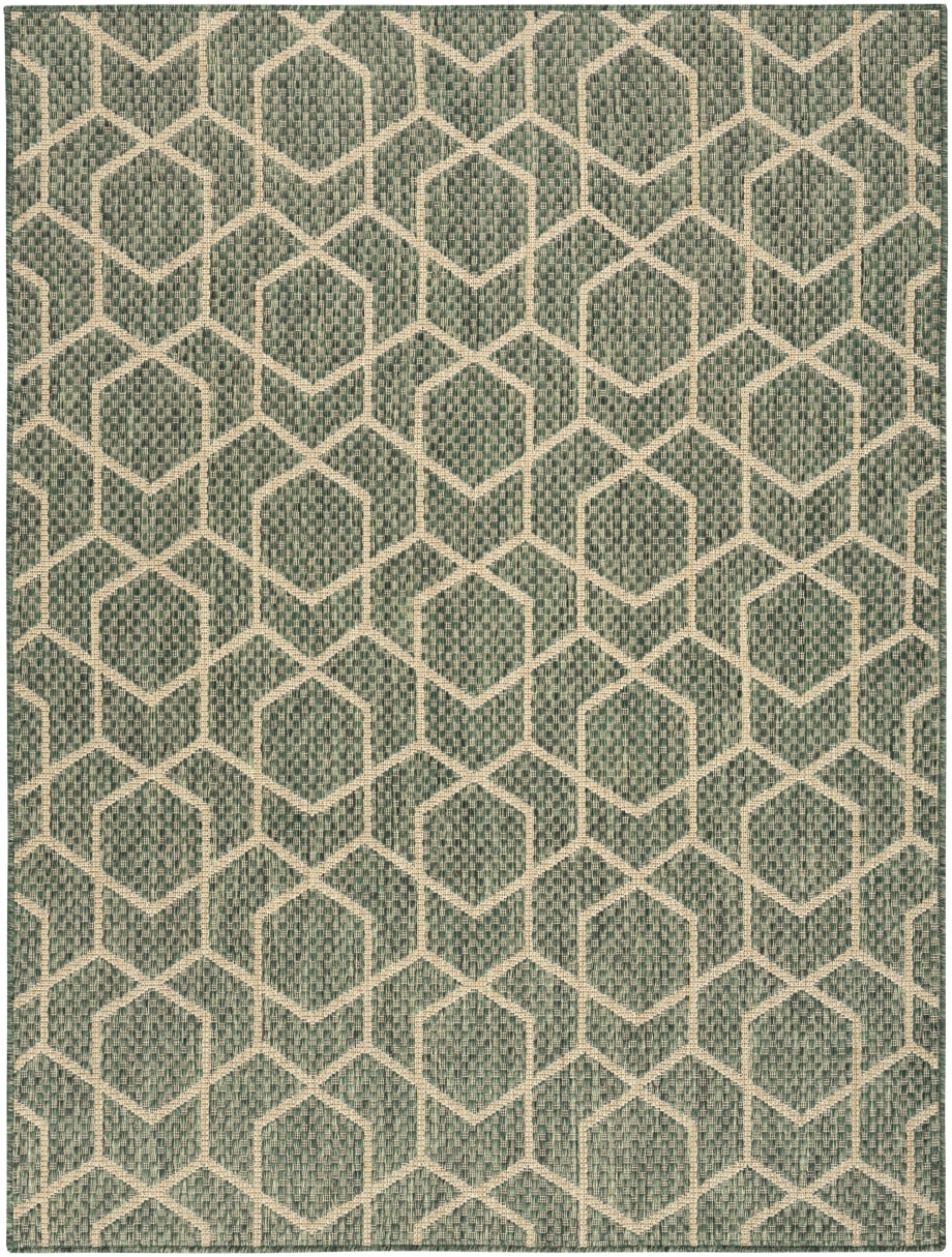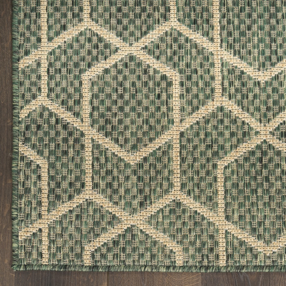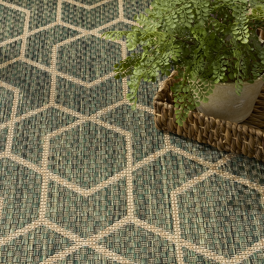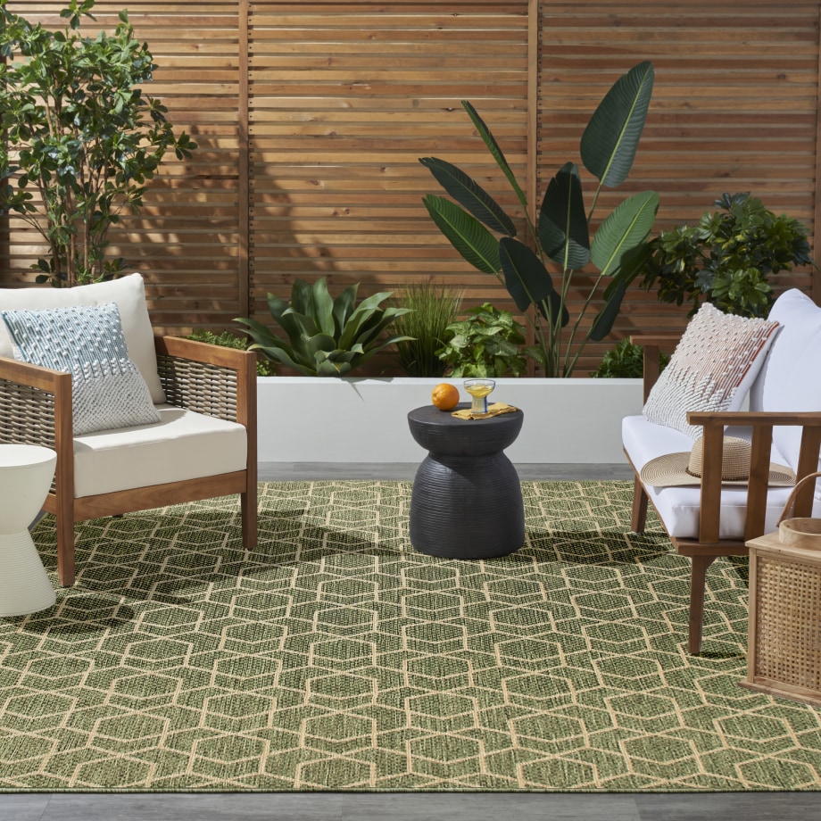 Sleek and modern, this green geometric outdoor rug from the Horizon Collection offers a contemporary take on classic design. The eye-catching pattern effortlessly complements a variety of settings —from urban balconies to cozy living rooms — while adding depth and visual appeal. This flatweave rug is made from a blend of polyester and polypropylene with a subtle high-low pile and tonal variations.