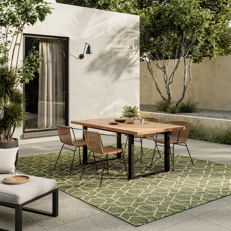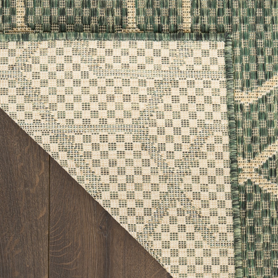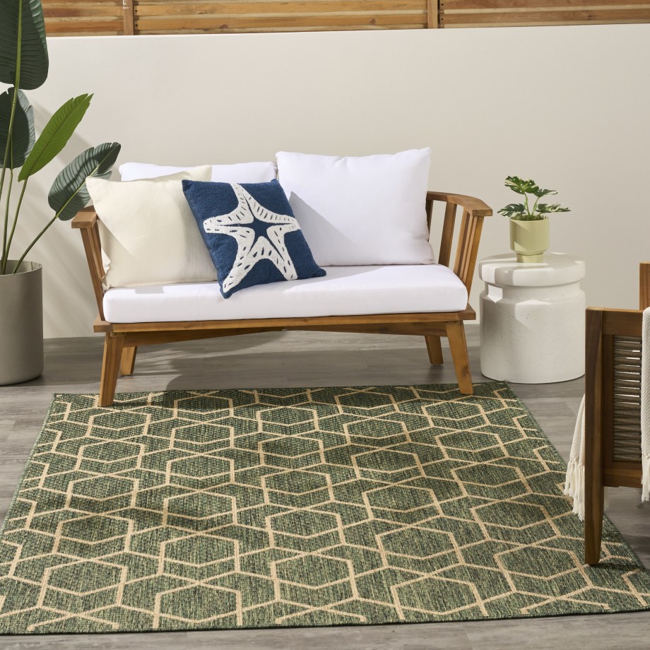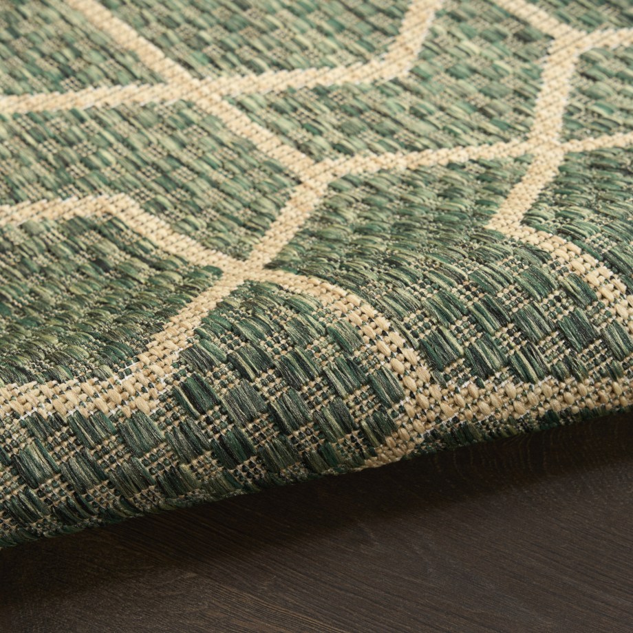 Sleek and modern, this green geometric outdoor rug from the Horizon Collection offers a contemporary take on classic design. The eye-catching pattern effortlessly complements a variety of settings —from urban balconies to cozy living rooms — while adding depth and visual appeal. This flatweave rug is made from a blend of polyester and polypropylene with a subtle high-low pile and tonal variations.