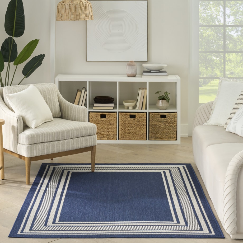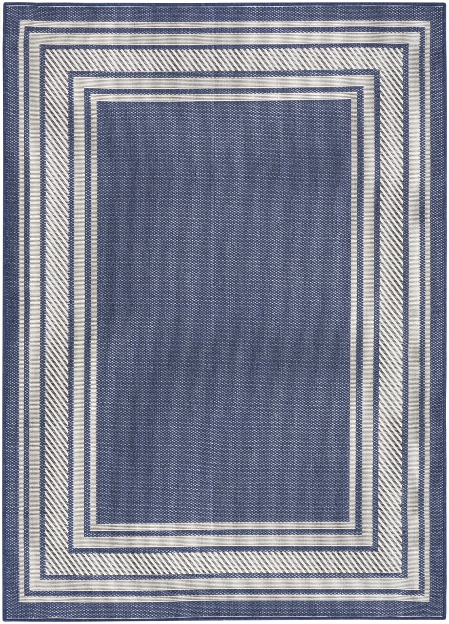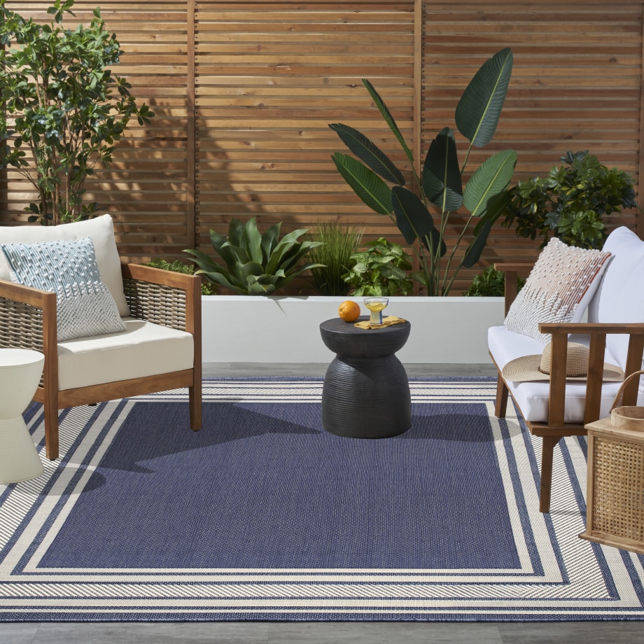 Transform any space with this modern navy-blue outdoor rug from the Horizon collection. Showcasing a striking bordered design, this rug beautifully frames your space while adding structure to patio conversation or living room and dining room seating areas. The two-tone palette, enhanced with subtle tonal variations, helps draw the eye while creating a focal point for your décor. Made from a blend of polyester and polypropylene finished with a subtle high-low pile.