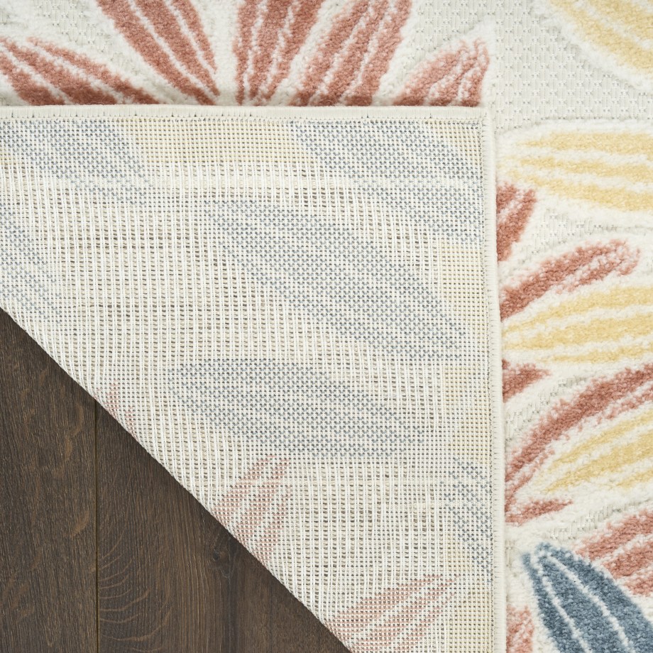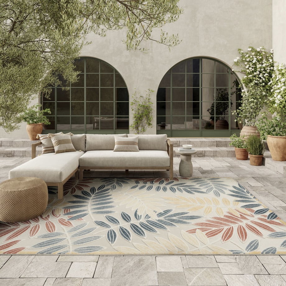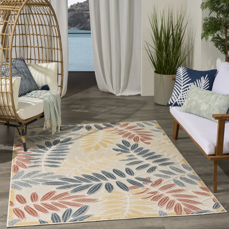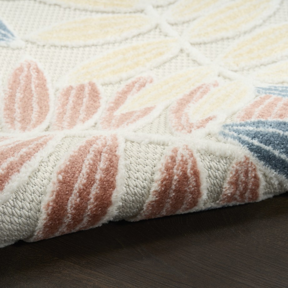 The cheerful and charming oversized leaf design of this Aloha outdoor rug is a fun way to bring tropical style to your patio, balcony, porch, deck, or yard. The high-low weave, presented in shades of ivory, rose, yellow, and blue, adds soft texture and a pop of dimension designed to spark conversation. Machine-made from premium stain-resistant fibers that are easily washable with a hose: simply rinse and allow both sides time to fully air dry. To extend the life of your rug, bring indoors during extreme weather.