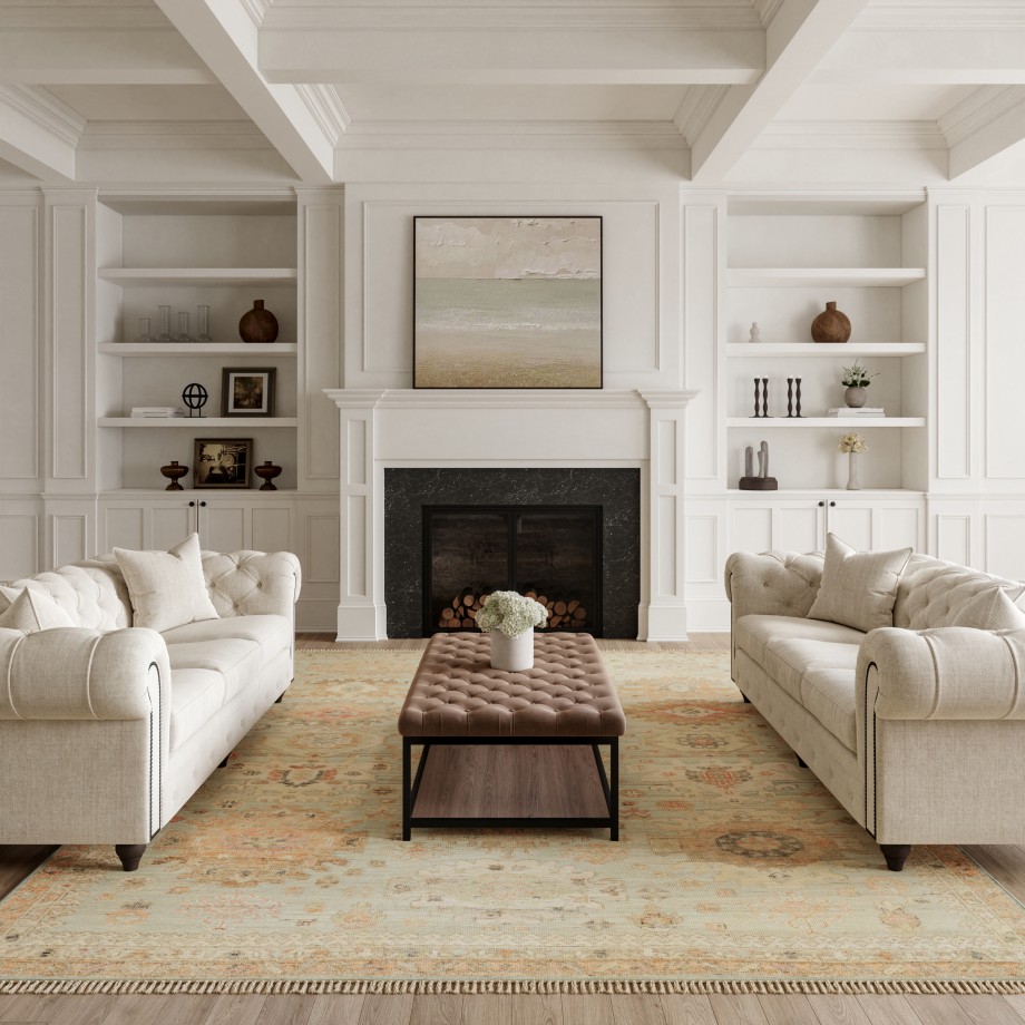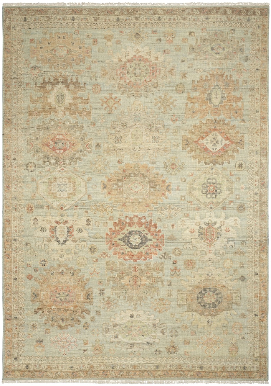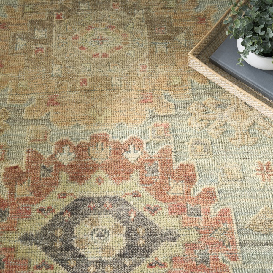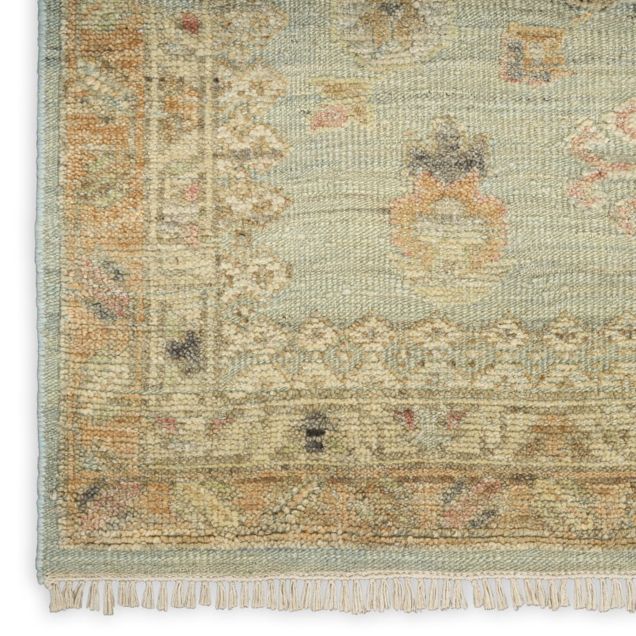 This vintage-inspired rug from the Heritage Vine Collection showcases an exquisite blend of timeless artistry and serene hues. The Persian-style pattern is hand-knotted using vegetable-dyed yarns that faithfully replicate an antique look. Finished with subtly dimensional accents and short fringe at both ends for added visual appeal.