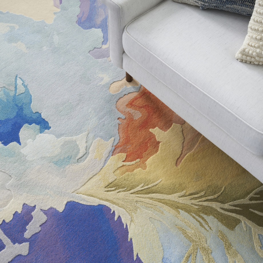 Add a unique burst of pattern to your home with this abstract rug from the Prismatic Collection. Splashes of painterly blue, purple, yellow, orange, and green tones curve along the surface, creating a vibrant sense of movement designed to spark conversation. With carved details and shimmering accents, this modern rug is a standout addition to your living room or bedroom dcor. Made from a luxuriously soft blend of New Zealand wool and silk-like Luxcelle.
