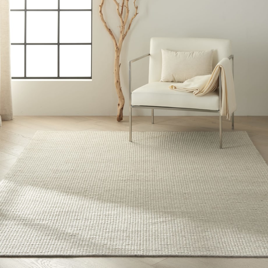 In cool grey and white tones, this hand woven natural Calvin Klein Lowland wool area rug merges understated color with striking design and a stunning surface texture to offer a modern, minimalist layer of laidback luxury to any interior.