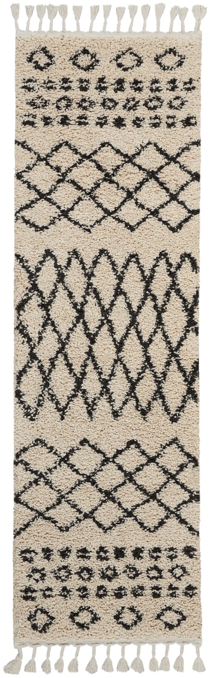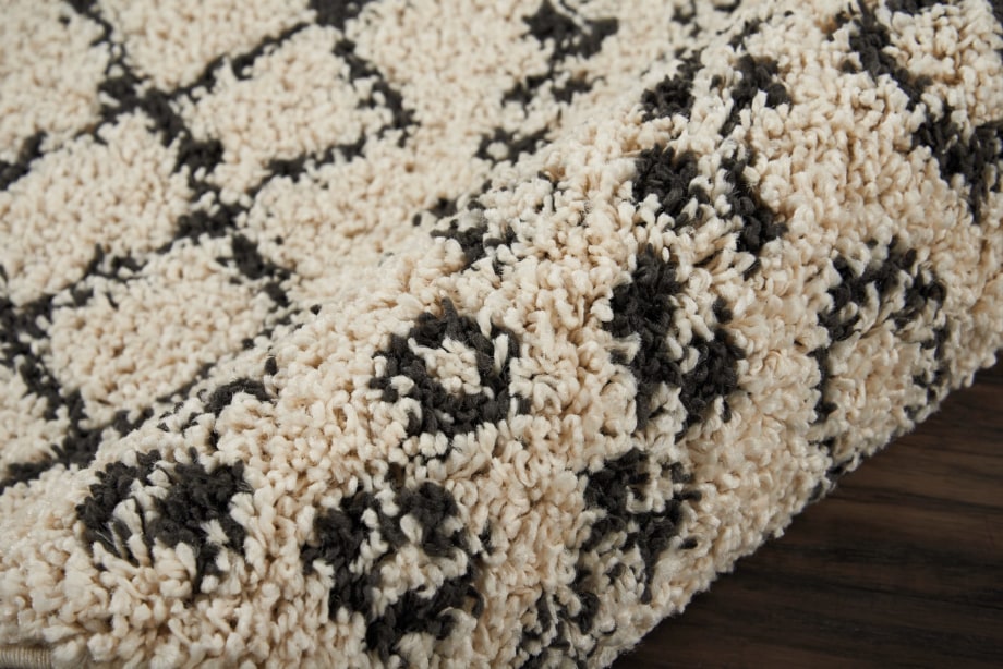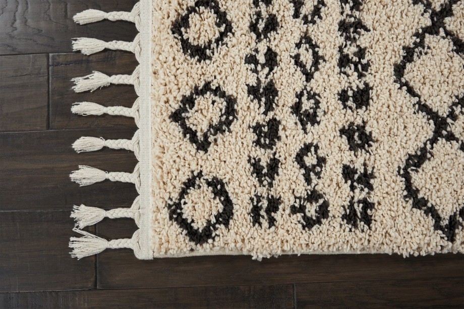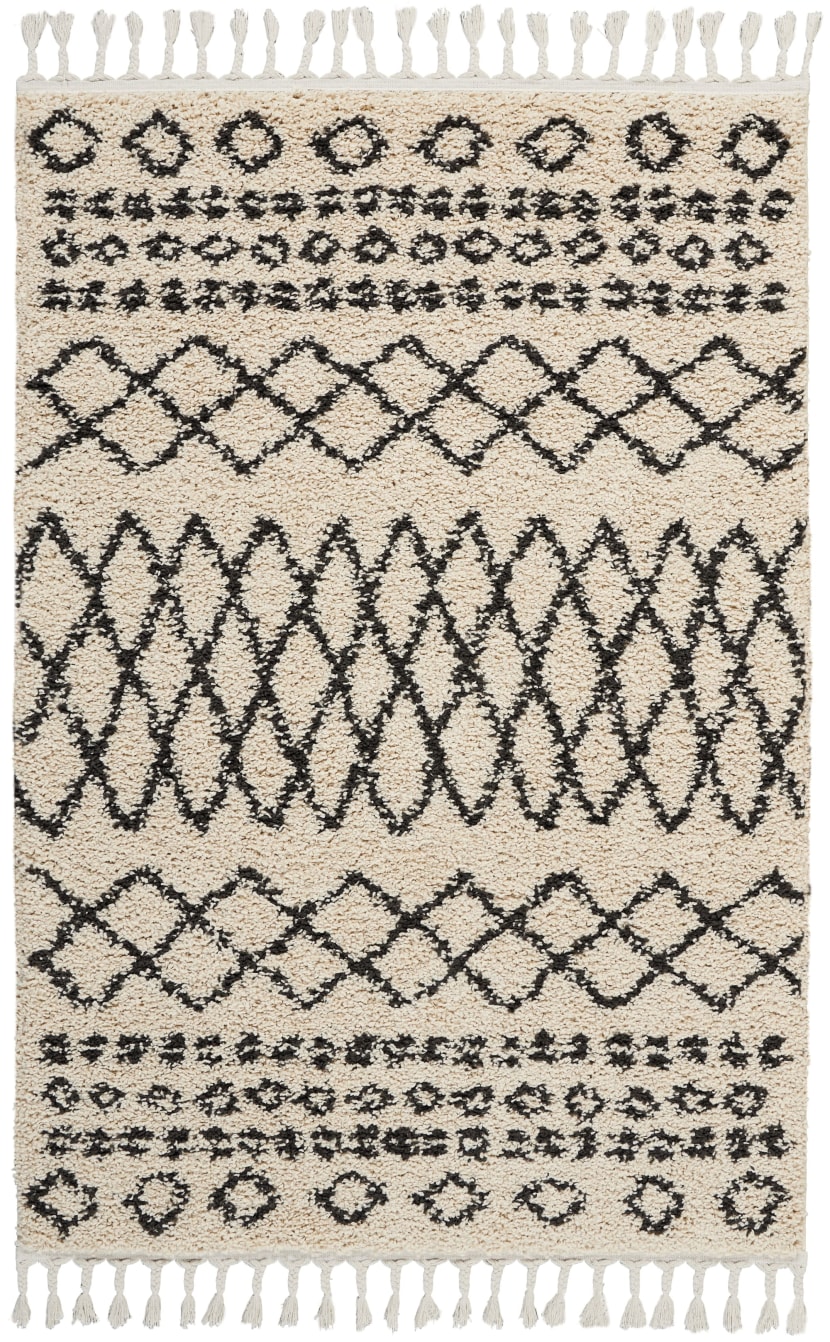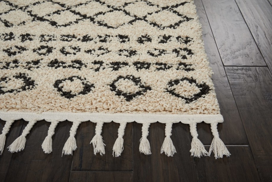 | A diamond design is extra fresh and flirty when festooned with cheerful tassels and drawn with a vintage tribal feel in a contemporary two-tone color palette of cream and black. Hand loomed from an outstanding 100% Polypropylene Friese for long wear, easy care, and a luxurious shag look and feel, this Moroccan shag area rug from Nourison is guaranteed to up the excitement ante of any interior. |