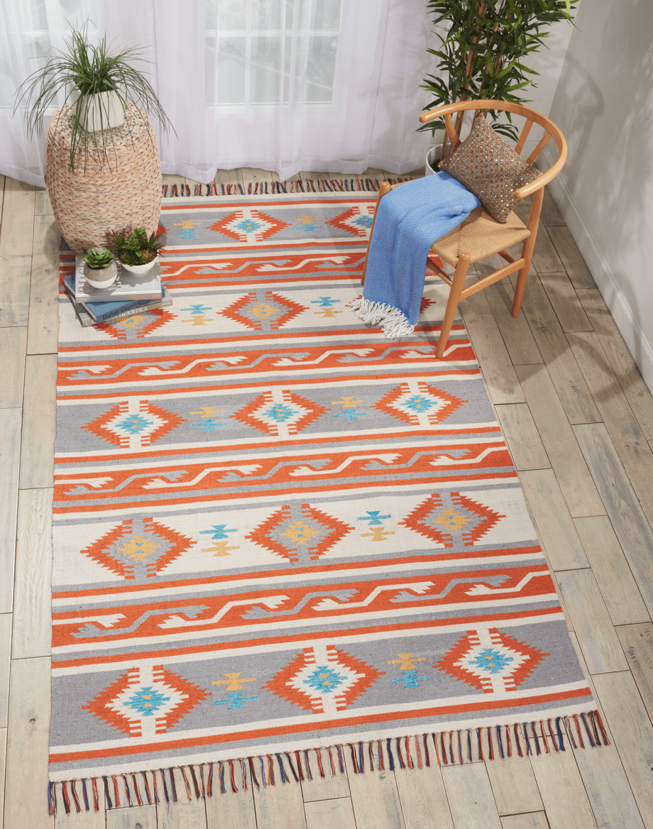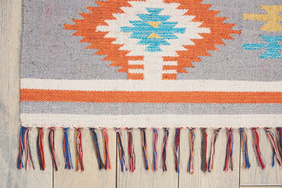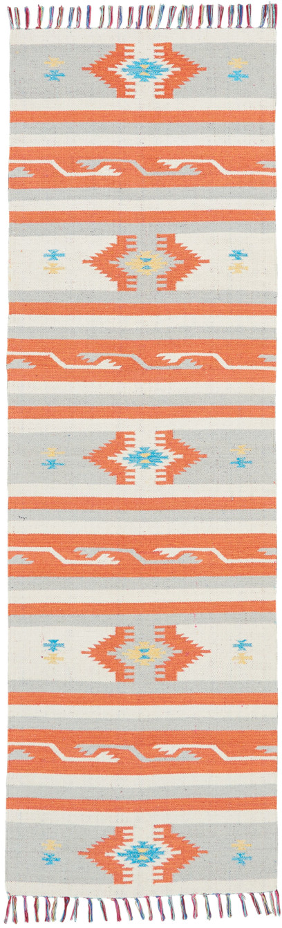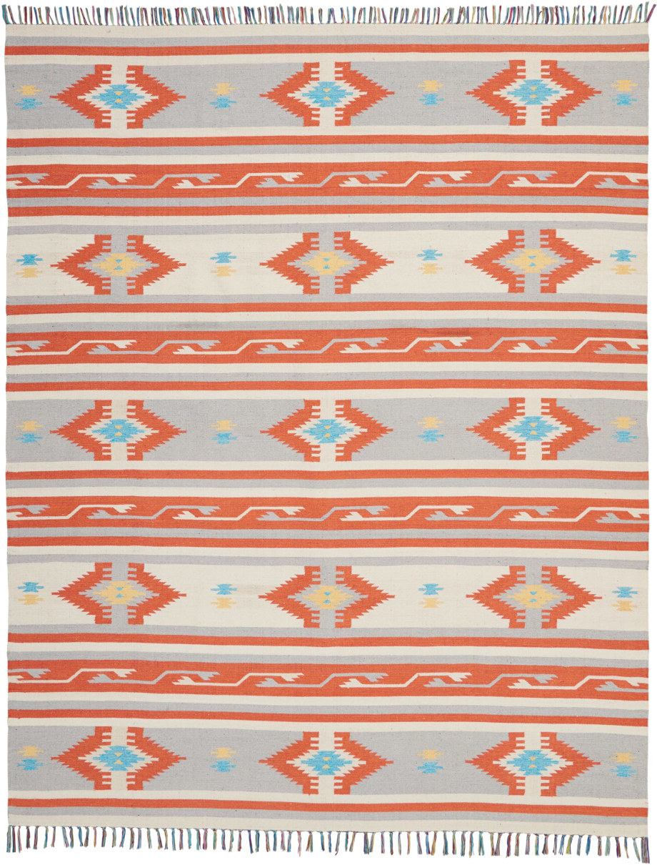 | Marvelous ikat medallions with zig-zag edges create the dynamic tribal pattern of this Moroccan influenced area rug. Part of the Baja Collection, it is handsomely woven in flat-weave, kilim style of pure, natural cotton fibers. Stunning in a color medley of tangerine and turquoise on sunshine yellow; finely fringed; and reversible for extra wear. |