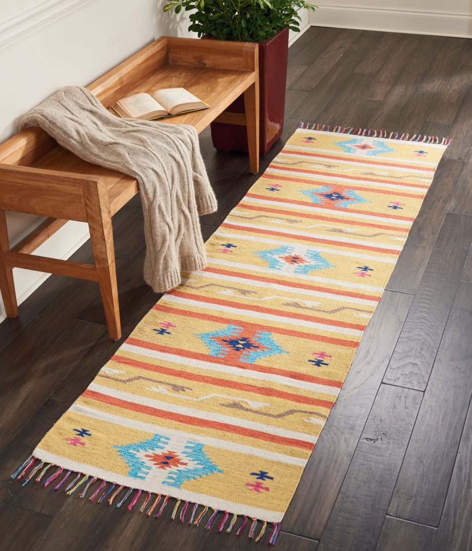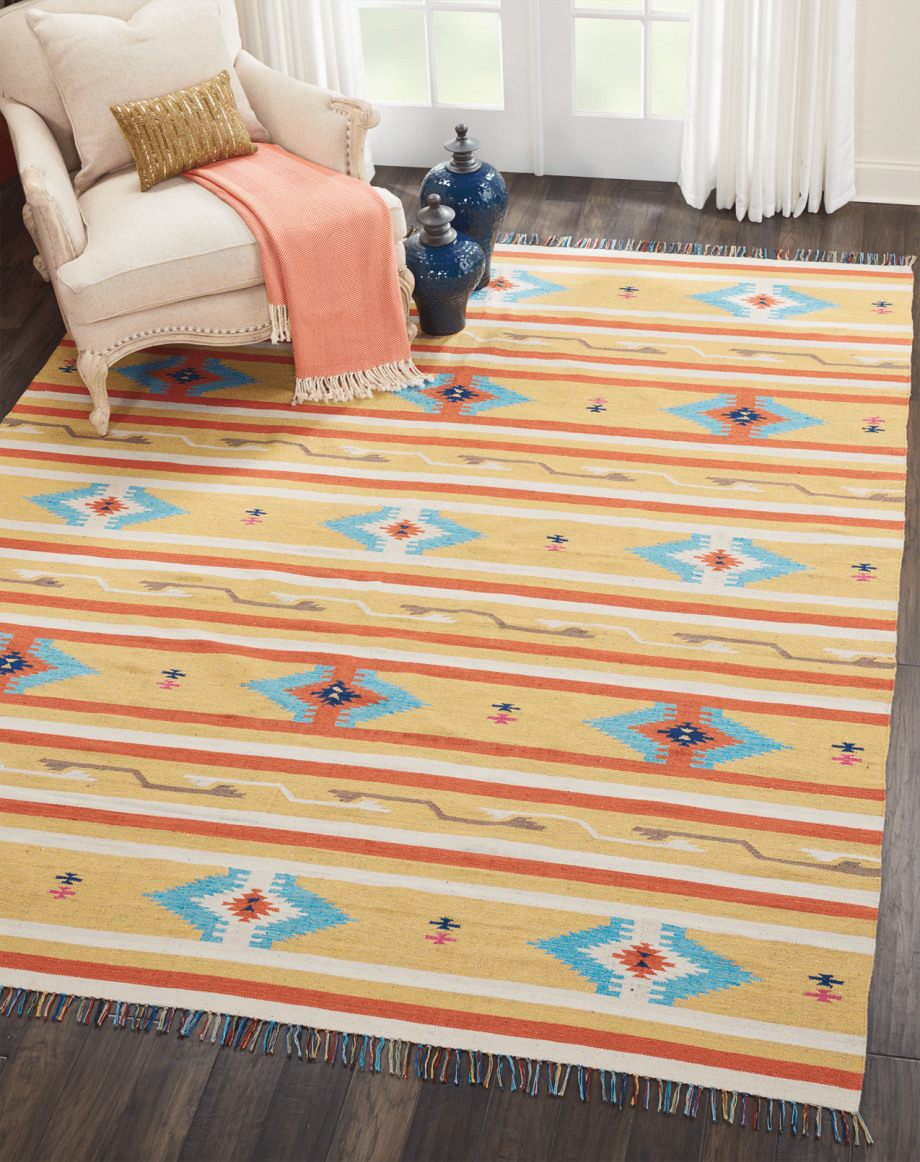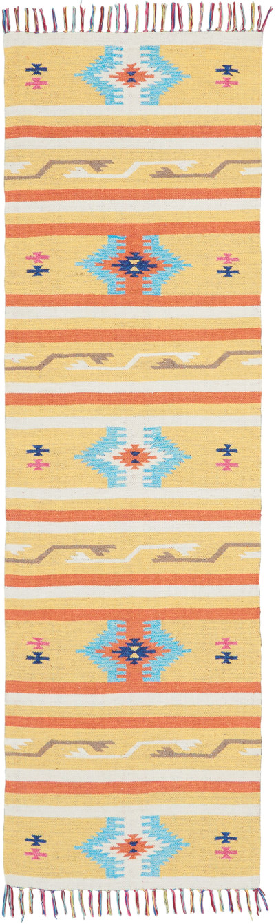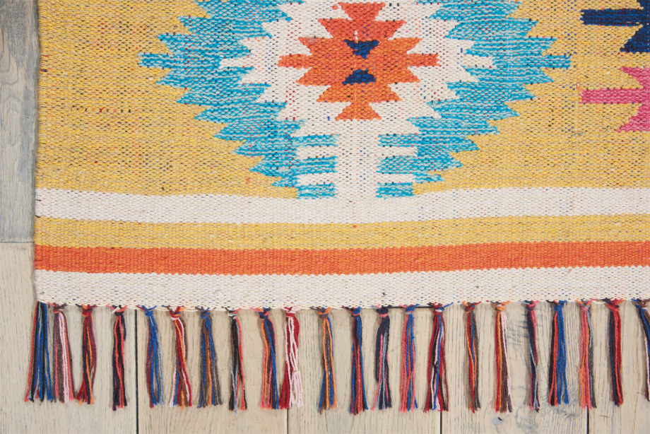 Marvelous ikat medallions with zig-zag edges create the dynamic tribal pattern of this Moroccan influenced area rug. Part of the Baja Collection, it is handsomely woven in flat-weave, kilim style of pure, natural cotton fibers. Stunning in a color medley of tangerine and turquoise on sunshine yellow; finely fringed; and reversible for extra wear.