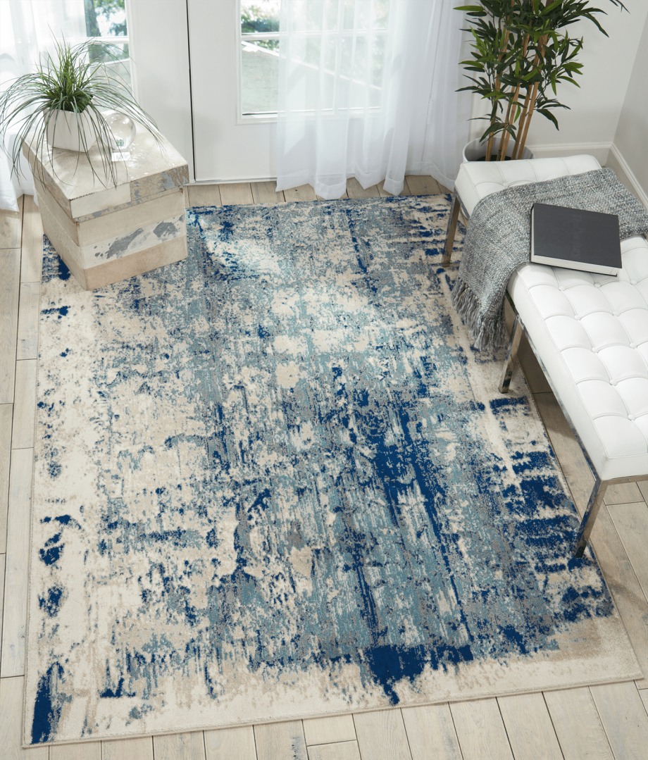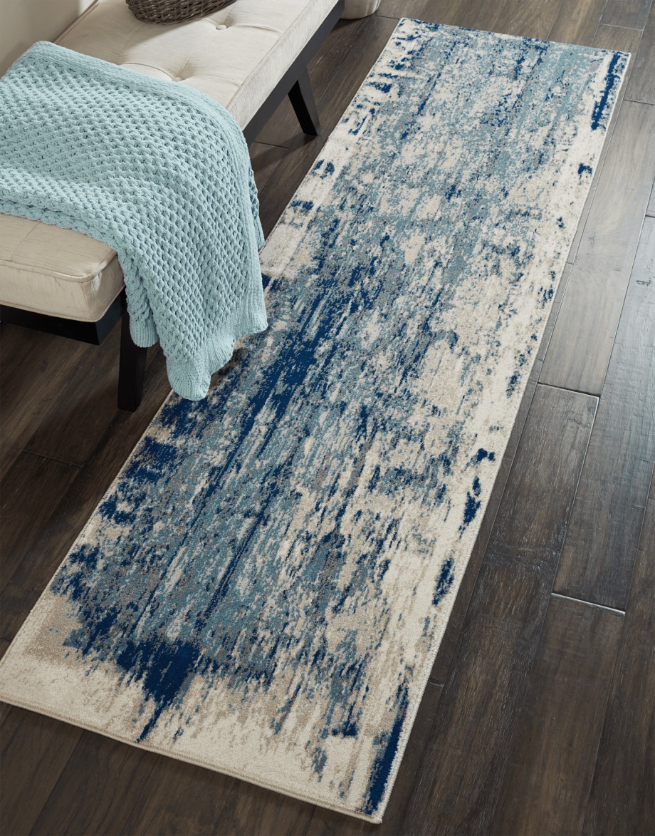 | This magnificently modern Maxell area rug elicits images of abstract artistry. Simulated brush strokes and splashes of rich blue, navy, ivory, and grey tones play out on a silky cut pile for a beautiful touch of contemporary comfort in any room in the home. |