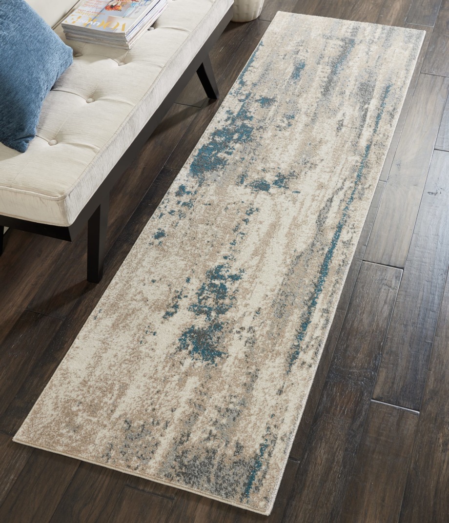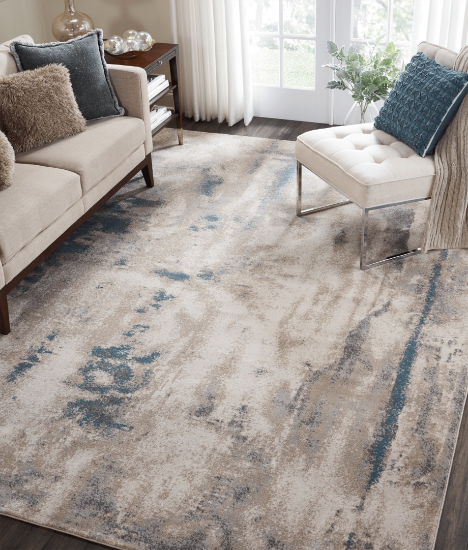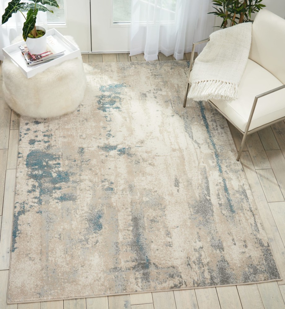 This magnificently modern Maxell area rug elicits images of abstract artistry. Simulated brush strokes and splashes of rich blue, navy, ivory, and grey tones play out on a silky cut pile for a beautiful touch of contemporary comfort in any room in the home.