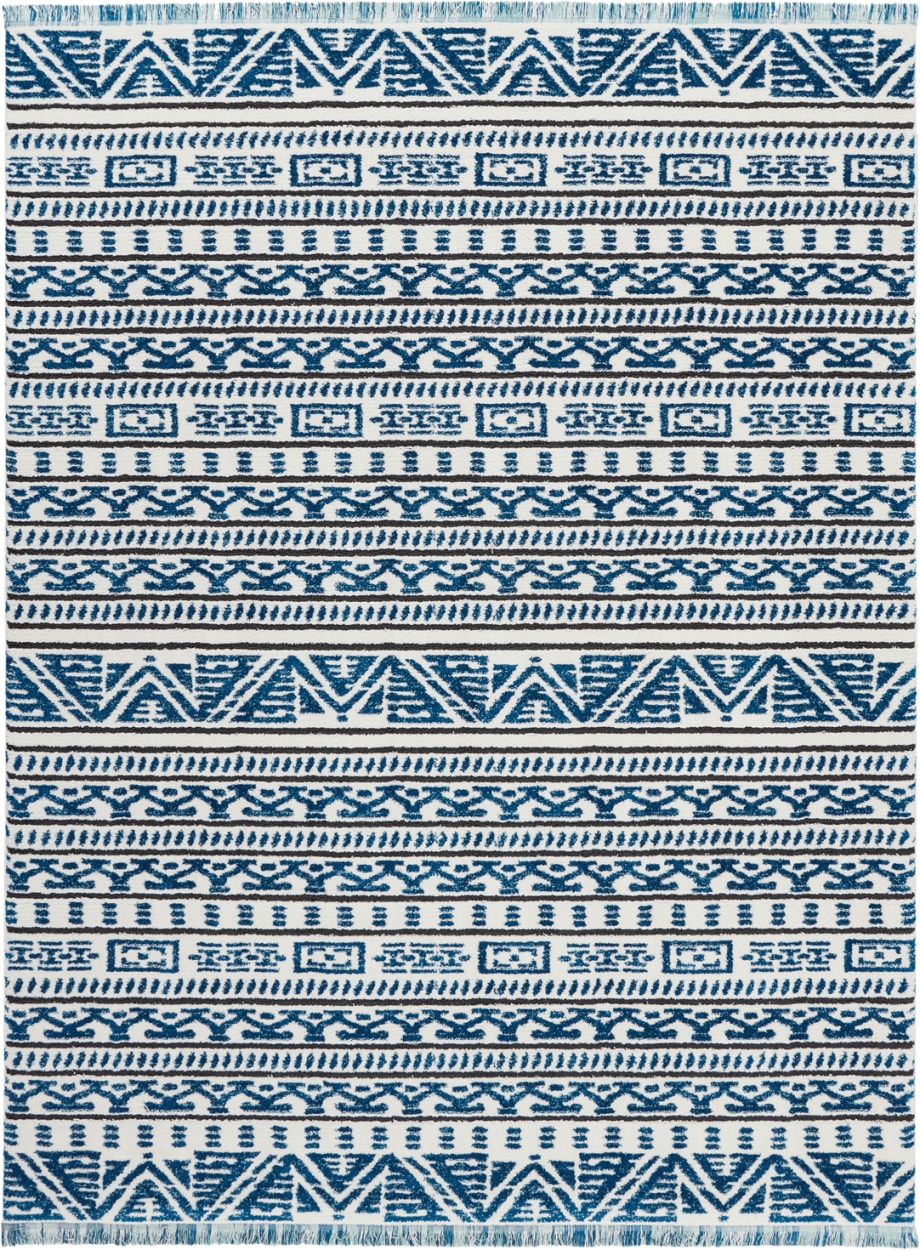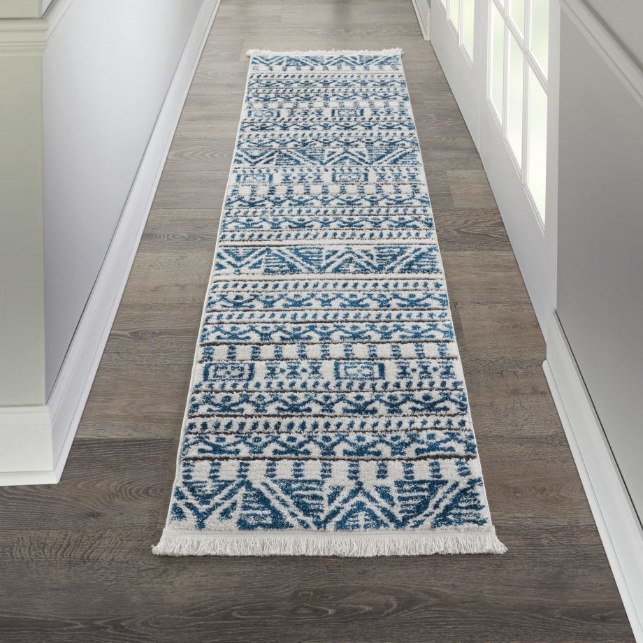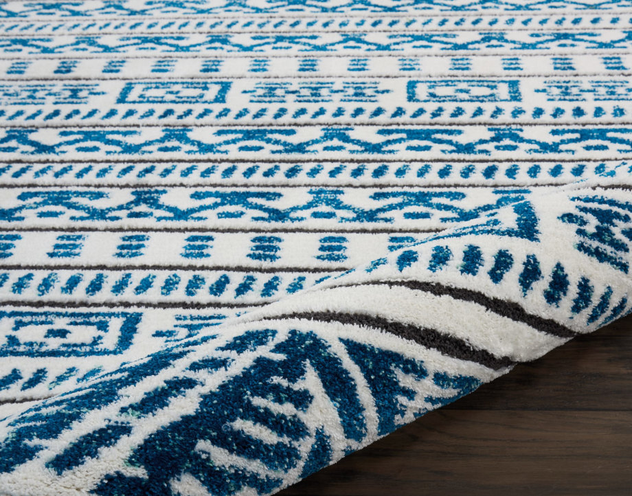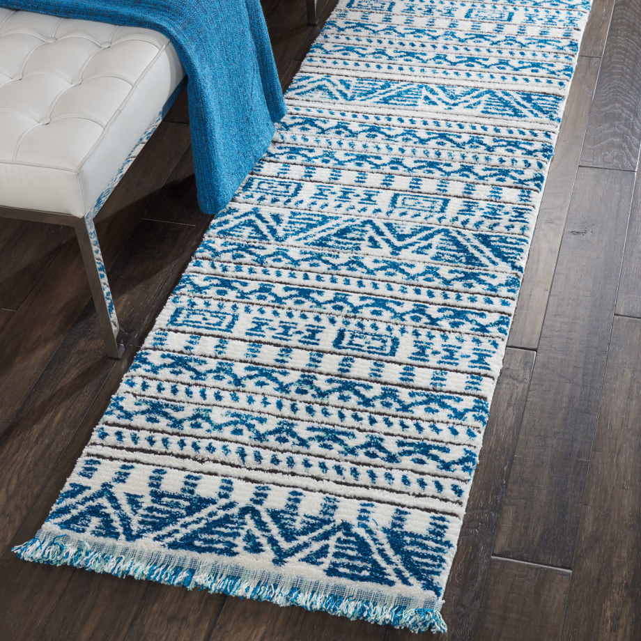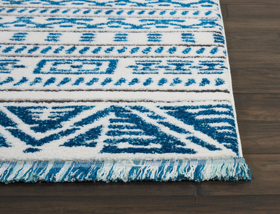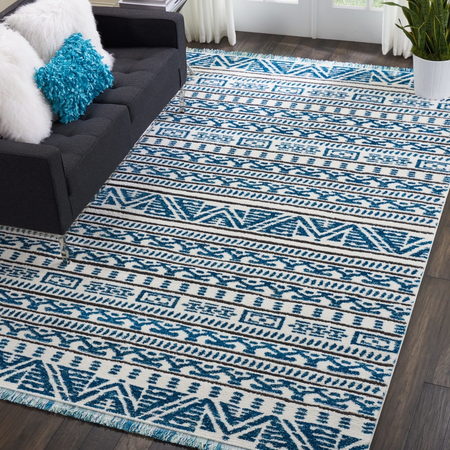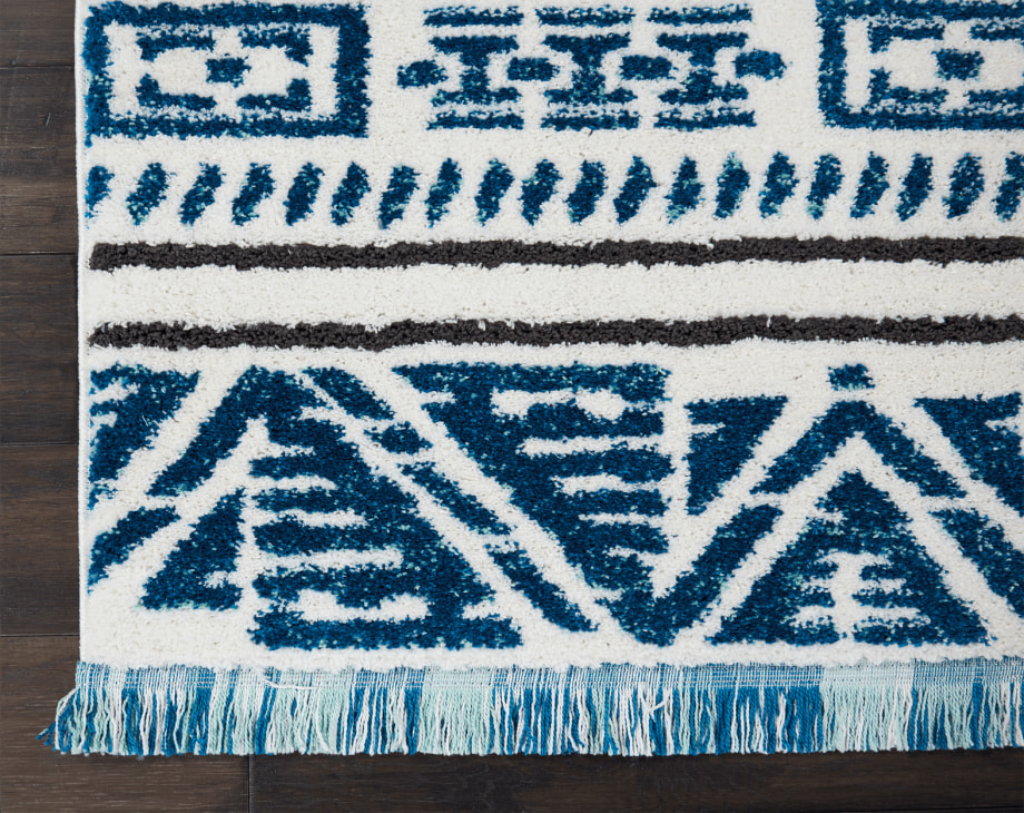 | With its plush low-pile shag texture and fantastic fringes, this blue and white Kamala area rug from Nourison is certain to steal the spotlight in any room it inhabits. Variations in the blue shag pile seem to shimmer with light in each row of tribal patterns. Powerloomed for stress-free care and a marvelous durability. |