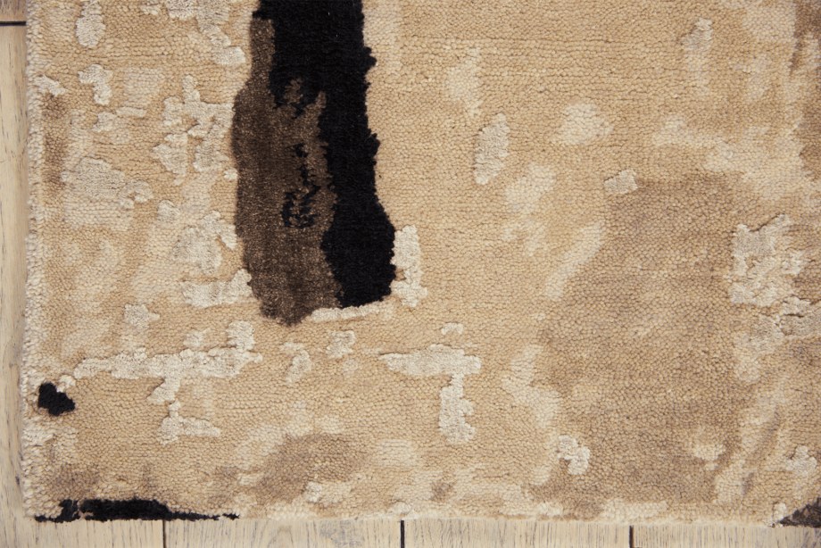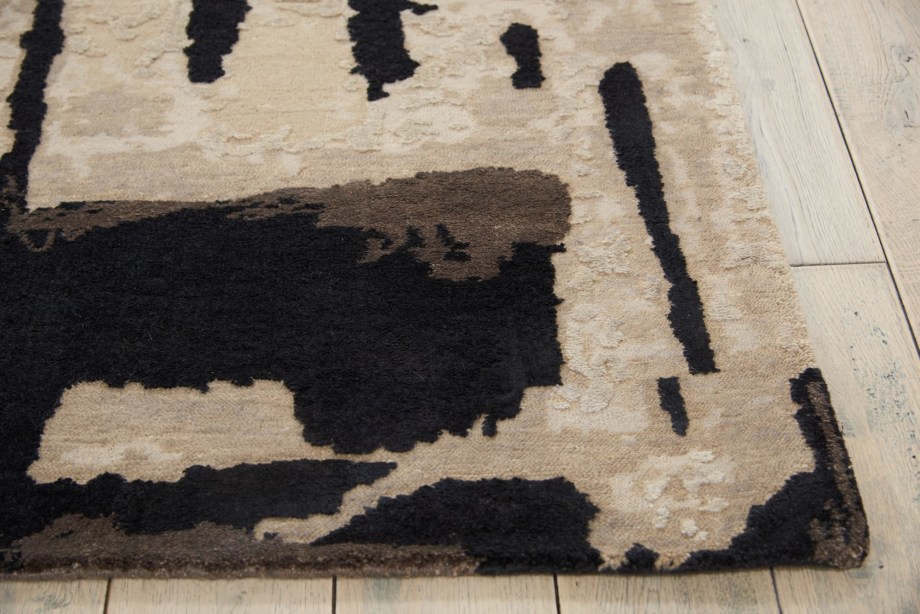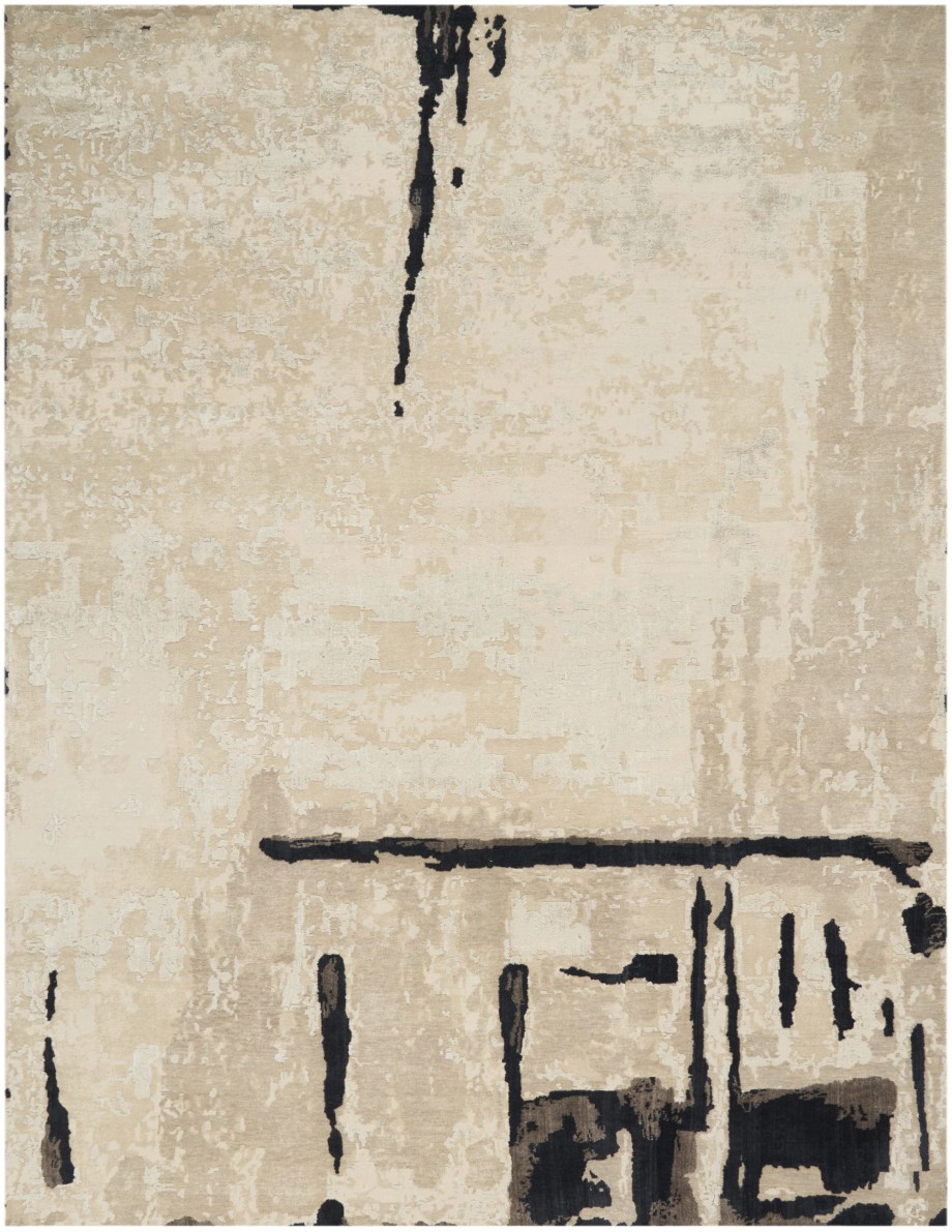A natural fabric punctuated with black and charcoal create a mesmerizing paint-stroke abstract effect in this one-of-a-kind rug.
