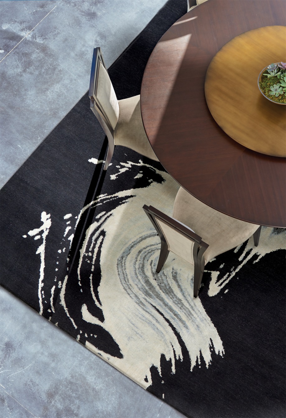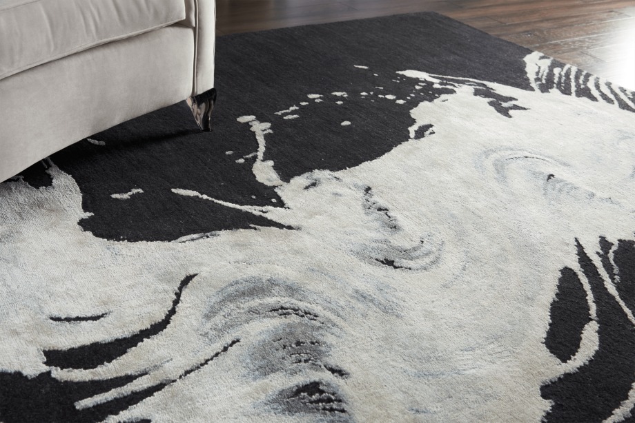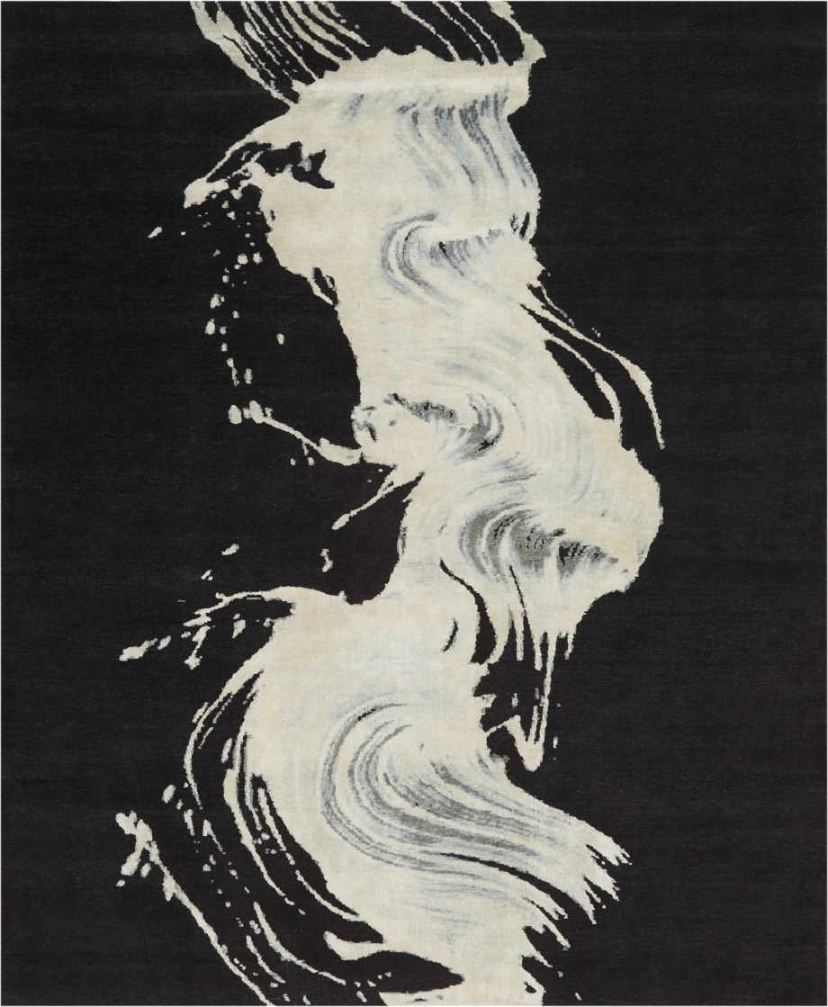 Natural light gris and blanc is set on a canvas of deep noir, creating a flowing and dynamic design of wool and silk.