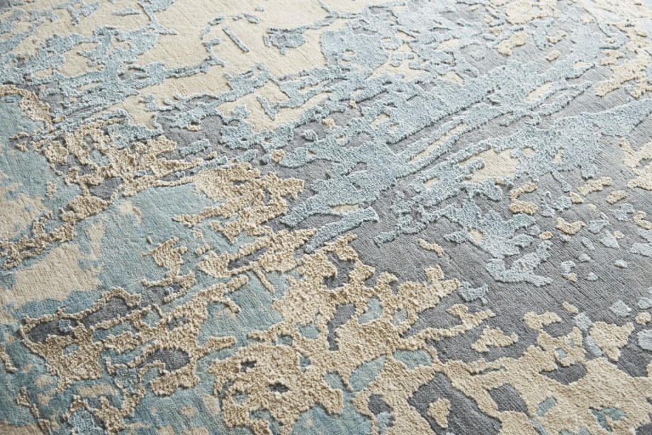 Dramatic textural patterns and rich, elegant colors give this Christopher Guy rug a thoroughly modern look. Raised pile design imbues the wool and silk with an artfully distressed style, with beautifully balanced tones of beige, grey, blue, and teal, creating a centerpiece for your home that's both dramatic and serene.