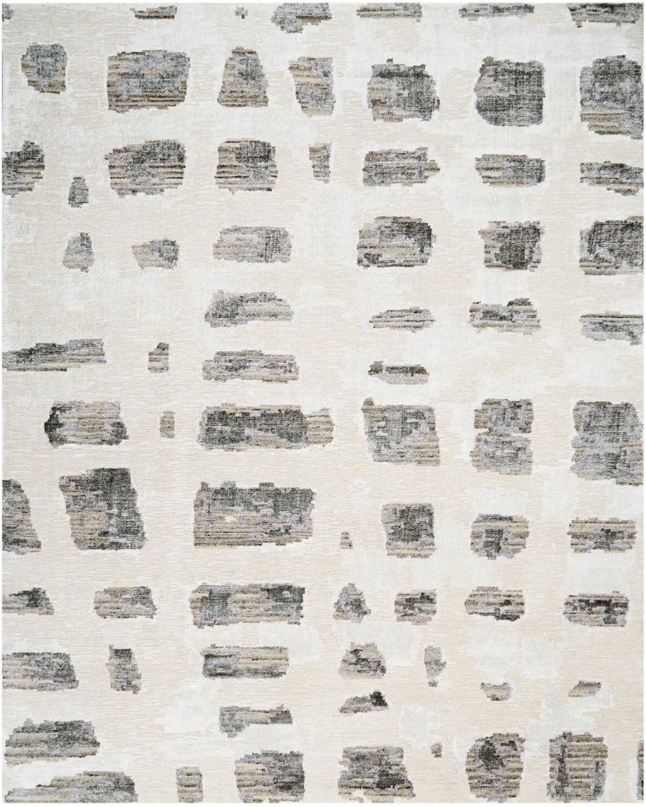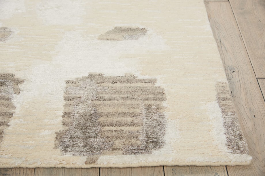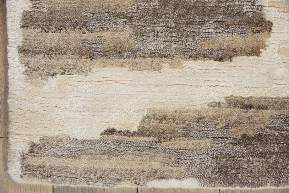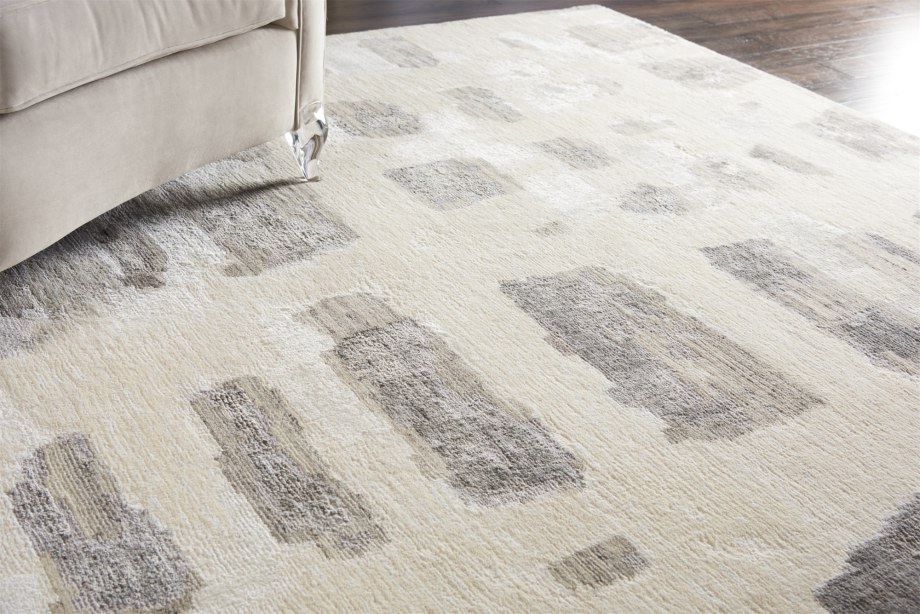 Light natural ones with shades of gray create a broad woven effect in this bold patterned rug of wool, linen, silk and bamboo.